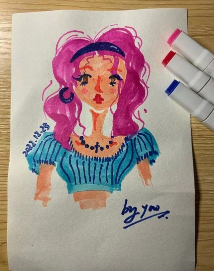 作品配文:这副不被定义由马克笔绘制而成,以青春为主旋律,高饱和的色彩来反映出不想被别人定义的内心,将头发换成紫色,眉毛换成橙色,加上不拘小节的笔触画出心中不被定义的自己。