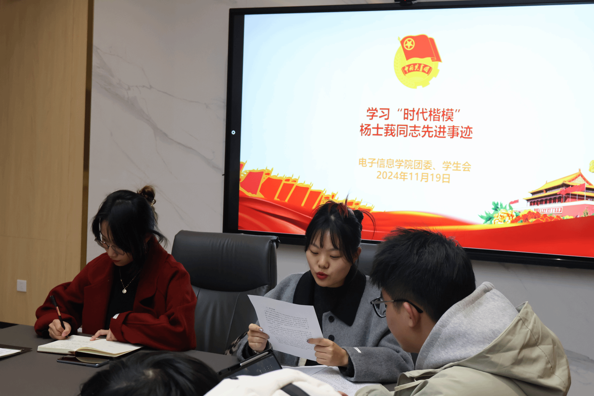 本次专题学习过程中,王嘉悦书记结合团委组织建设,带领大家深入学习了杨士莪同志个人事迹以及其背后的精神,并围绕主要内容和重点工作对其进行了解读,团学骨干认真投入,深入学习此次专题。