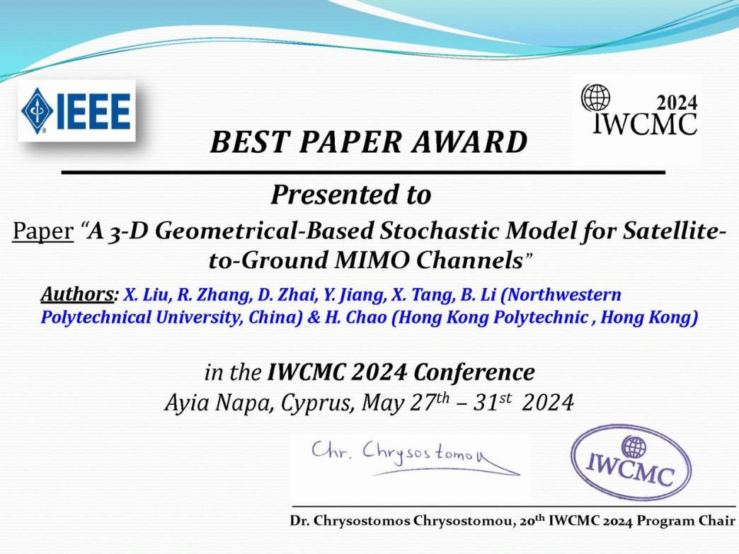 张若南教授课题组的论文《A 3-D Geometrical-Based Stochastic Model for Satellite-to-Ground MIMO Channels》凭借卓越的创新力荣获IWCMC´2024最佳论文奖。论文的第一作者为我院2021级硕士研究生刘新华。