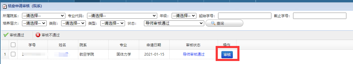 结业申请审核(院系):在相应功能中进行审核学生条件和材料是否符合要求。