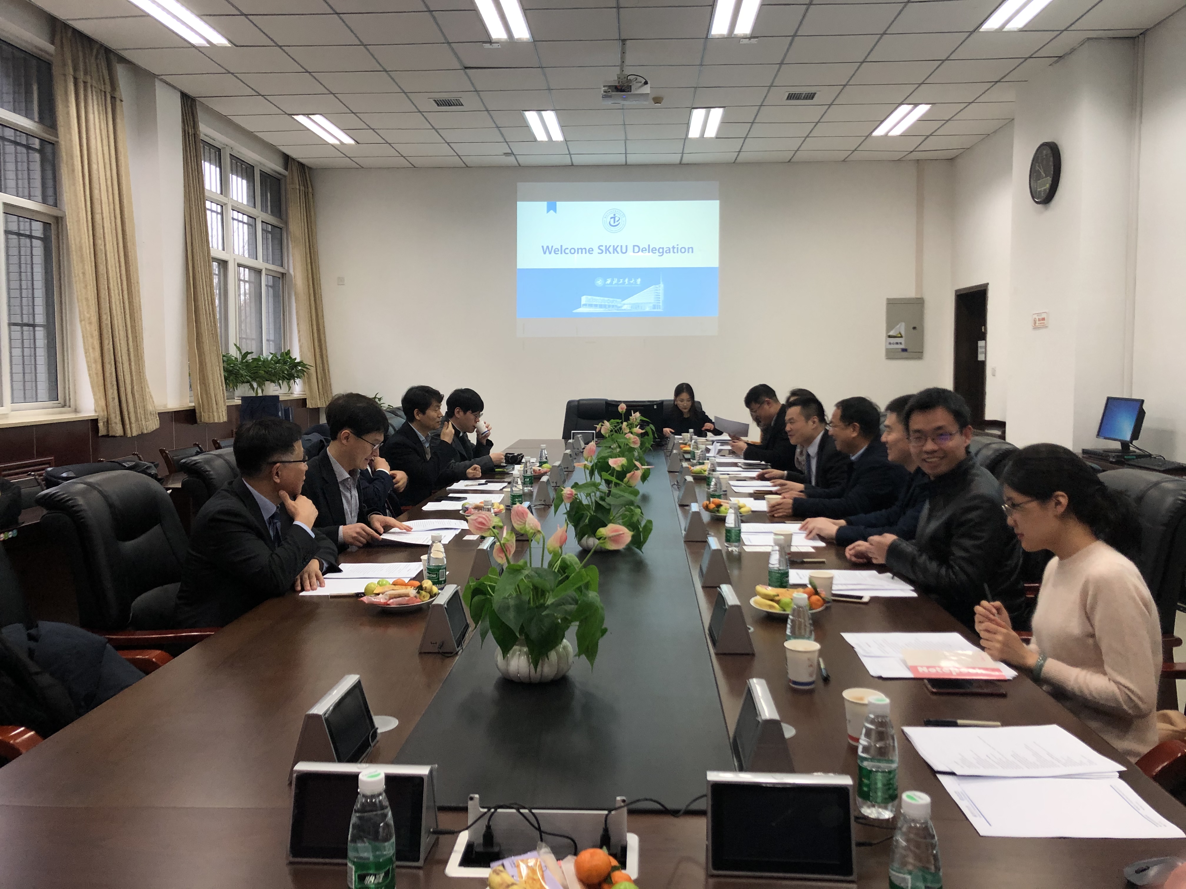 基本情况,并对成均馆大学一行来访表示热烈欢迎。随后双方就合作办学相关事宜进行了深入的交流讨论,并就建立国际联合科研实验室达成了一致意见。
